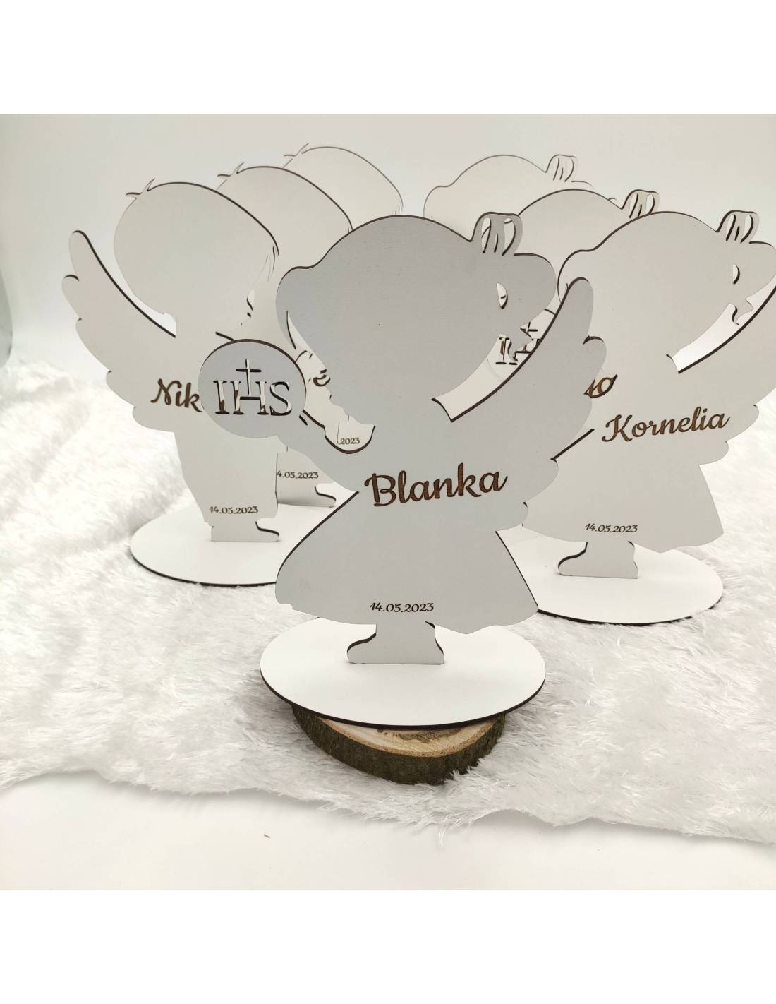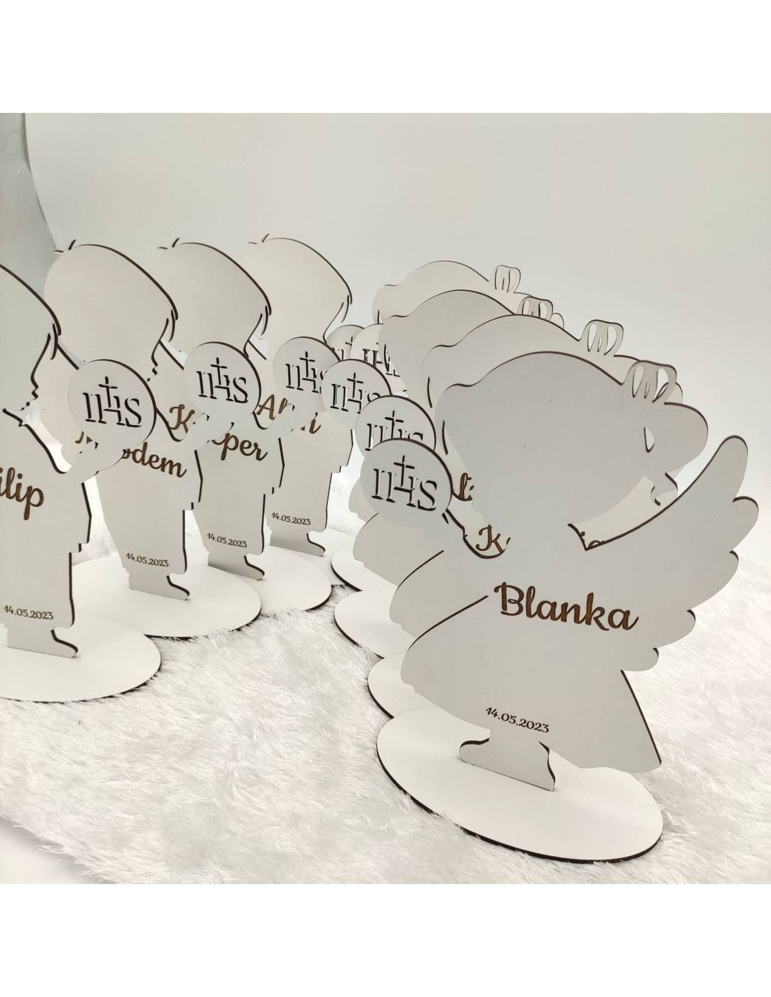 Aniołki wykonane z dwustronnego białego hdf-u z grawerem wykonanym laserowo.