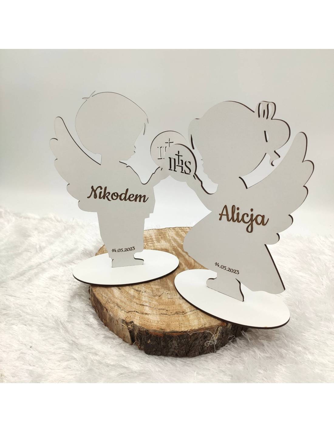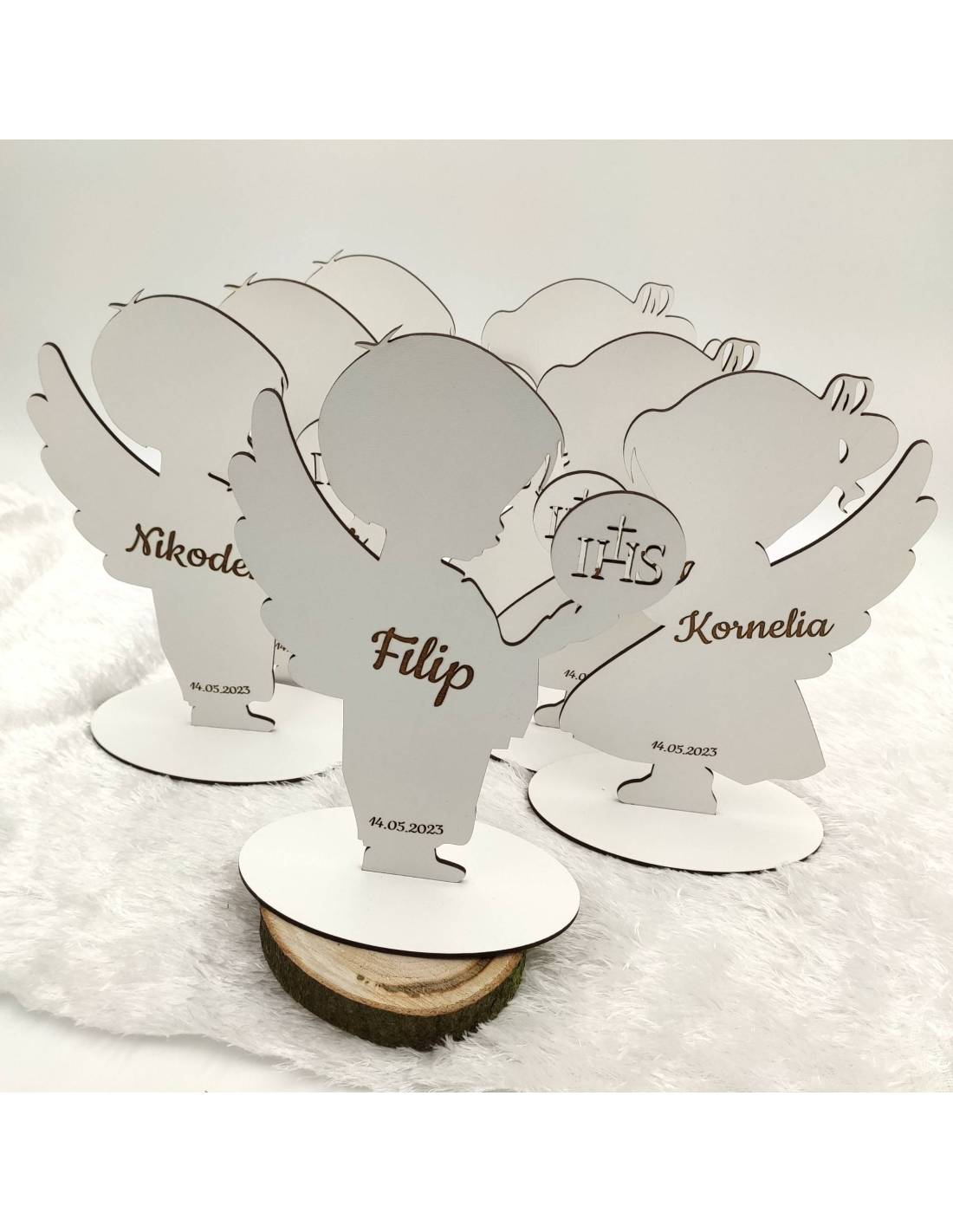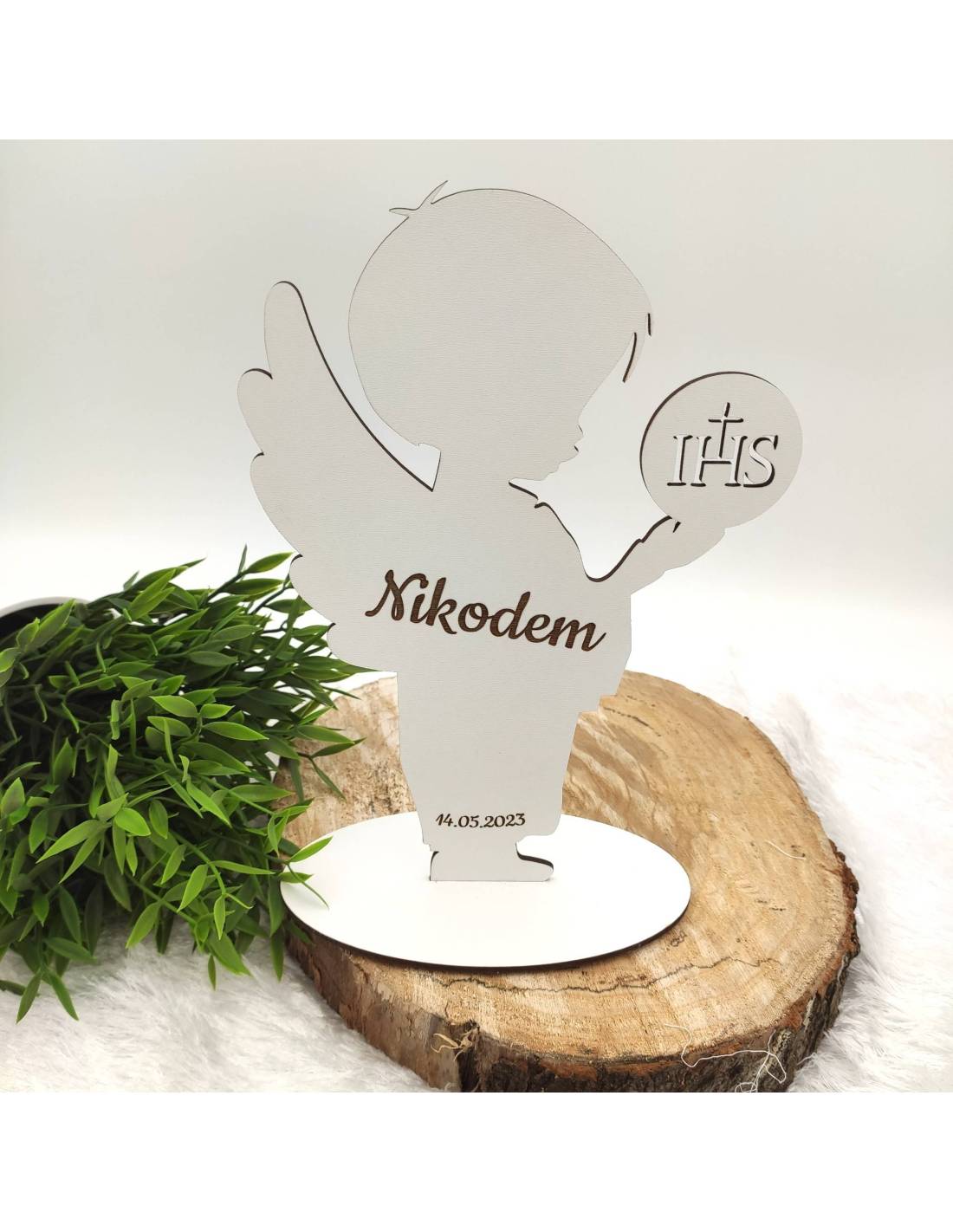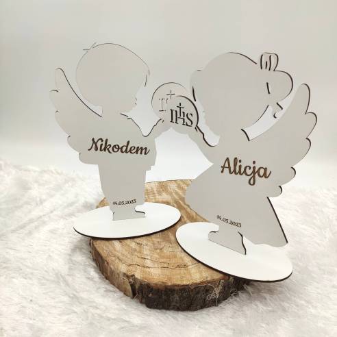 Aniołek - chłopiec lub dziewczynka - z personalizowanym grawerem, wykonany z białego dwustronnego HDF-u.