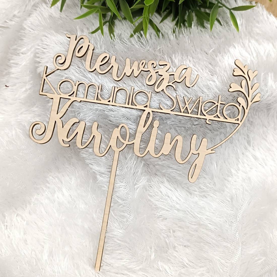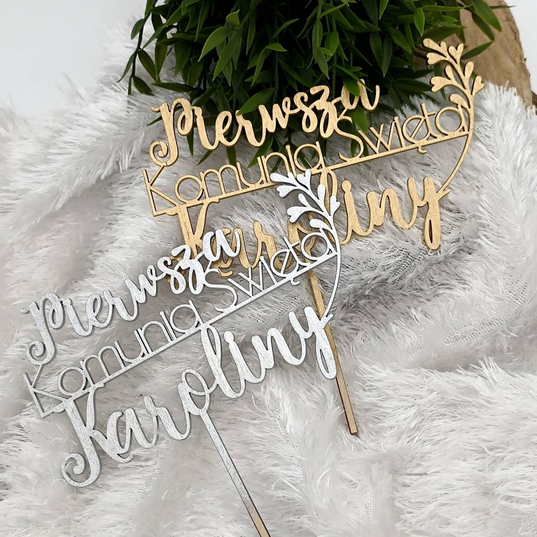 Personalizowany topper z elementem delikatnej gałązki to wyjątkowy akcent do komunijnego tortu.