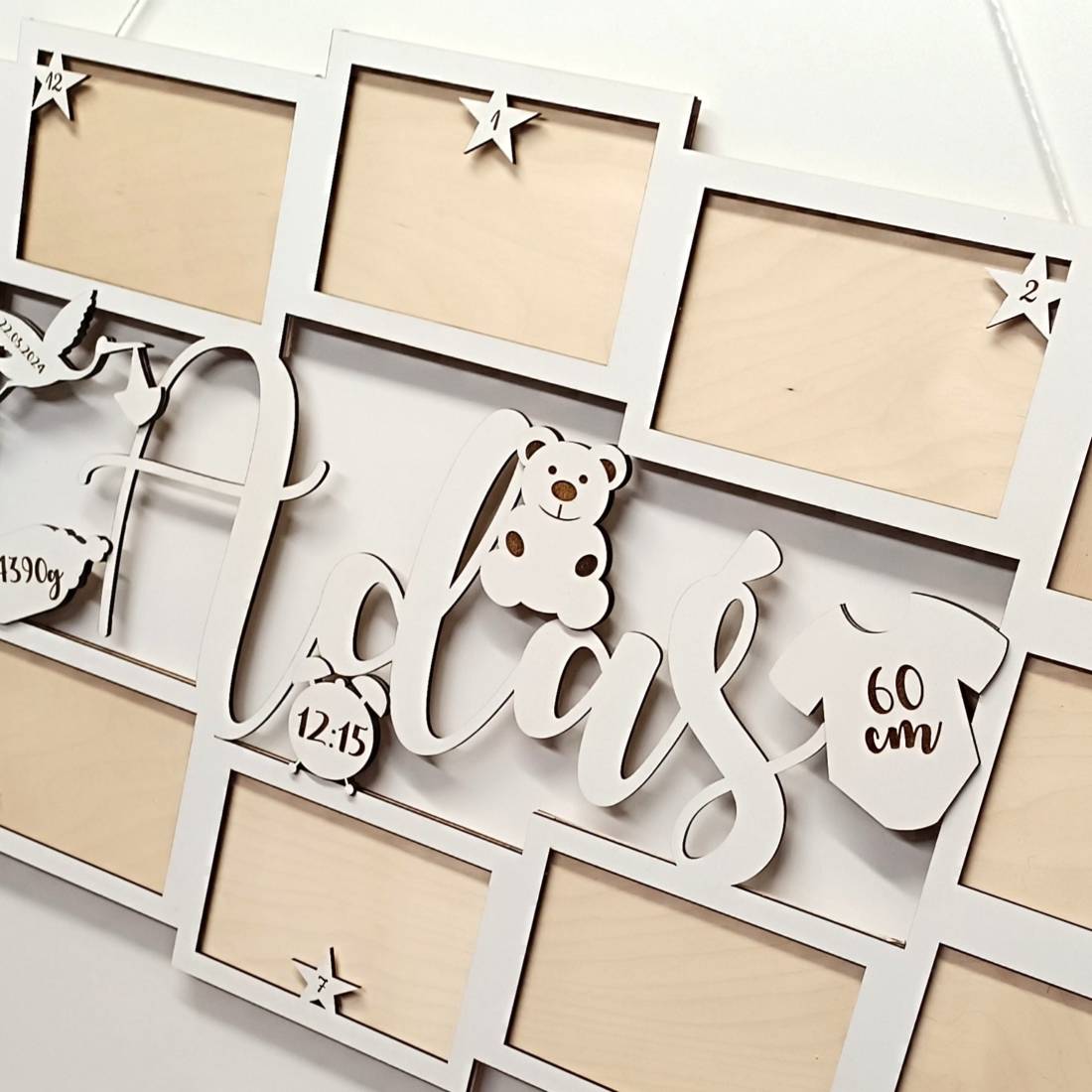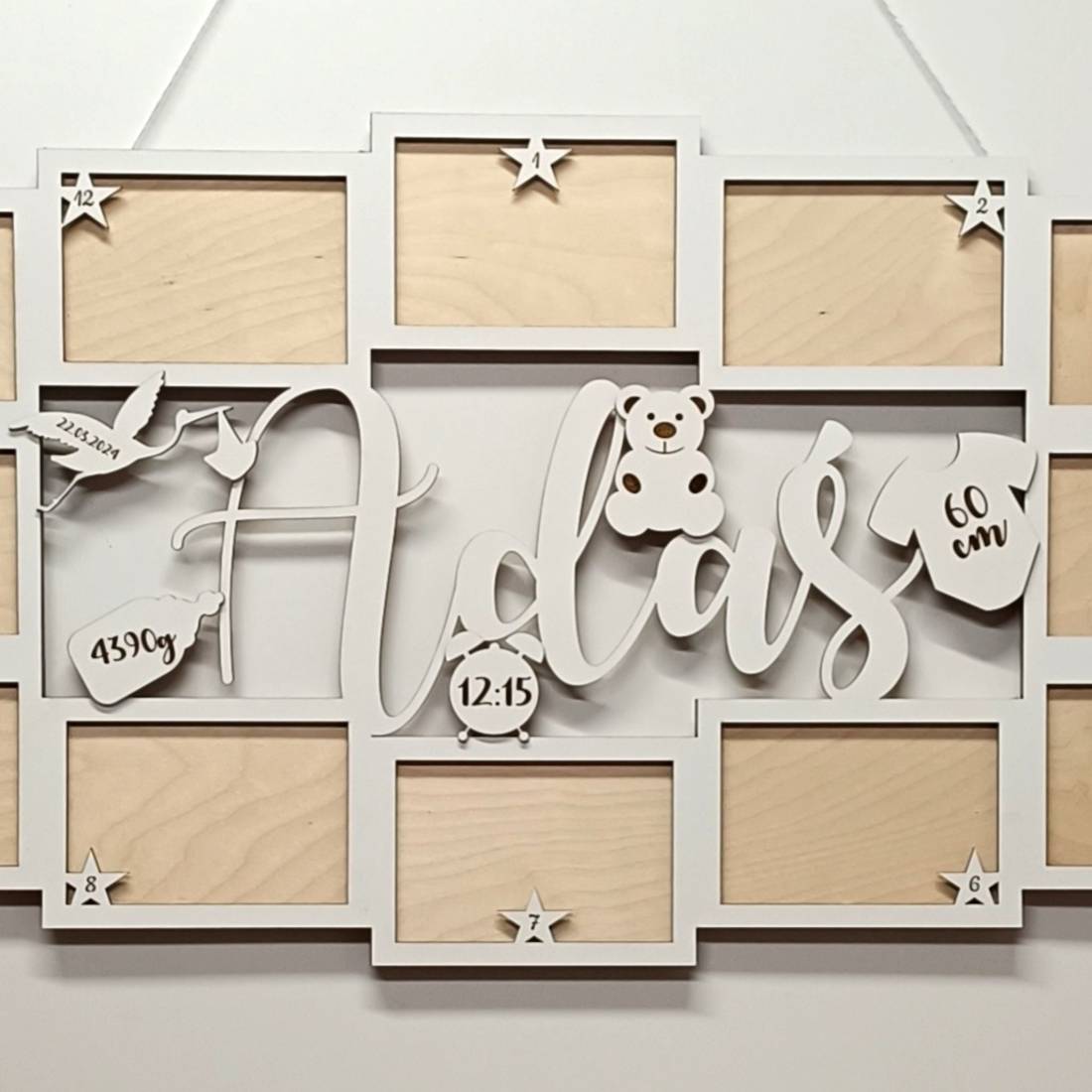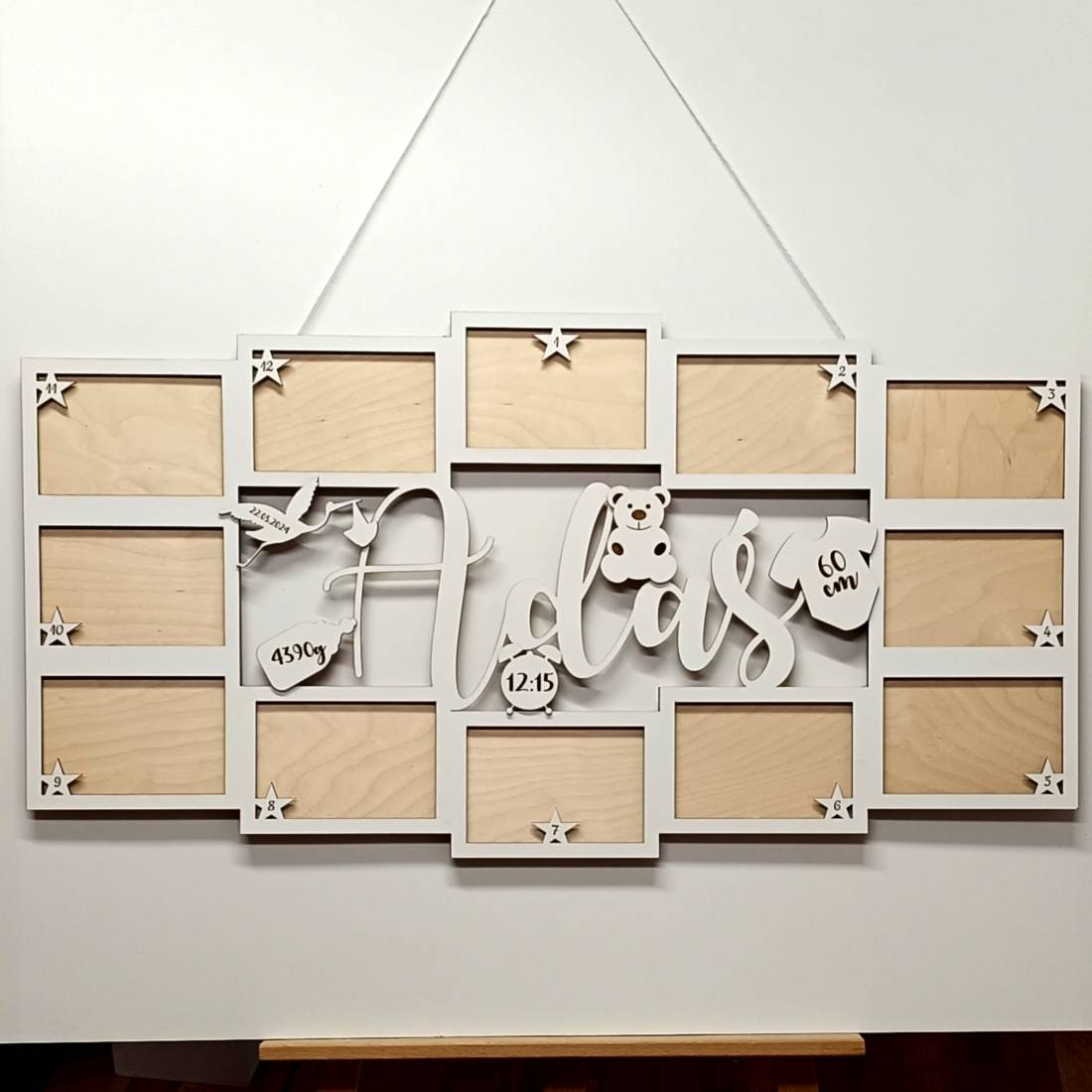 Ta elegancka dekoracja w wersji poziomej zawiera 12 ramek, zaprojektowanych specjalnie na zdjęcia z każdego z pierwszych 12 miesięcy życia dziecka.