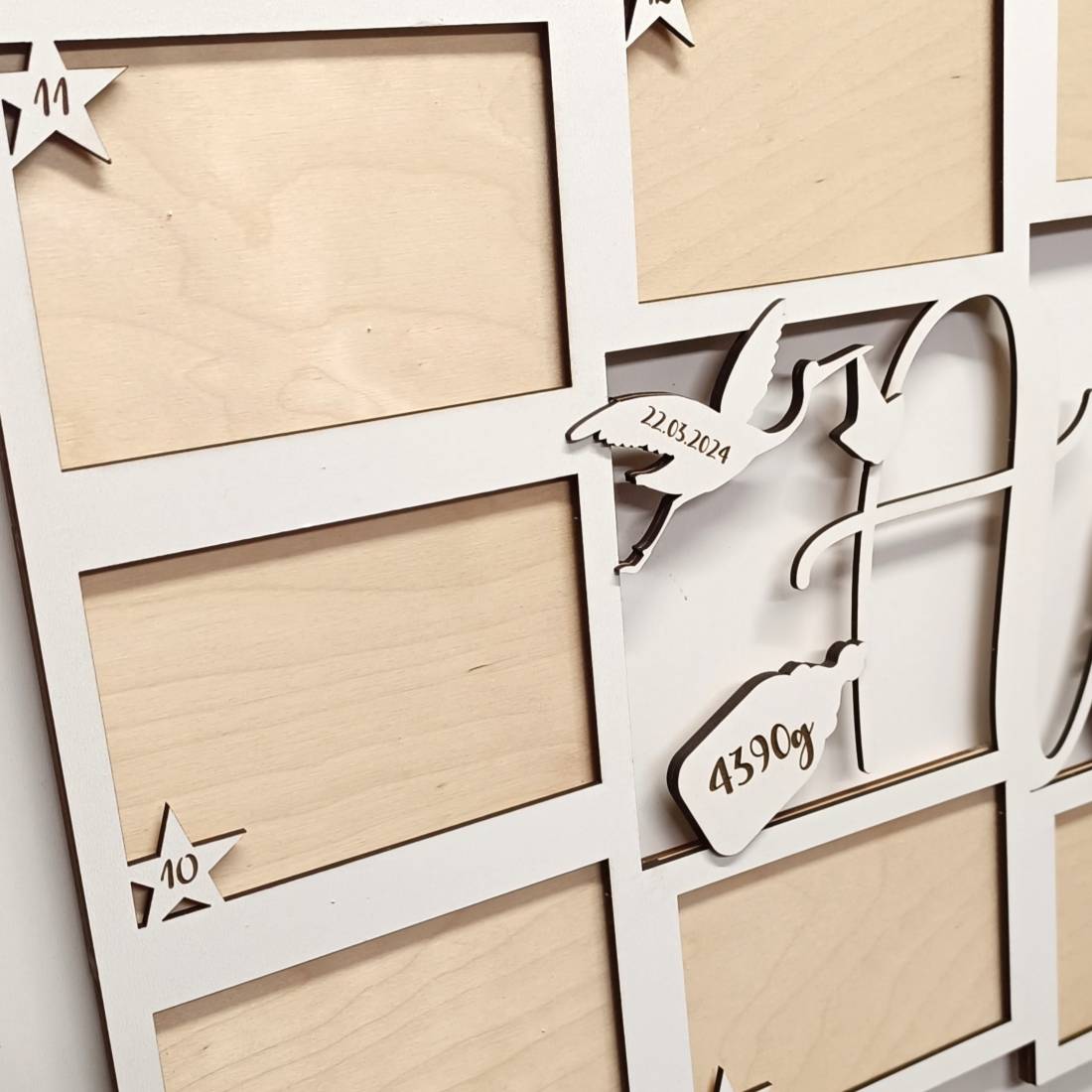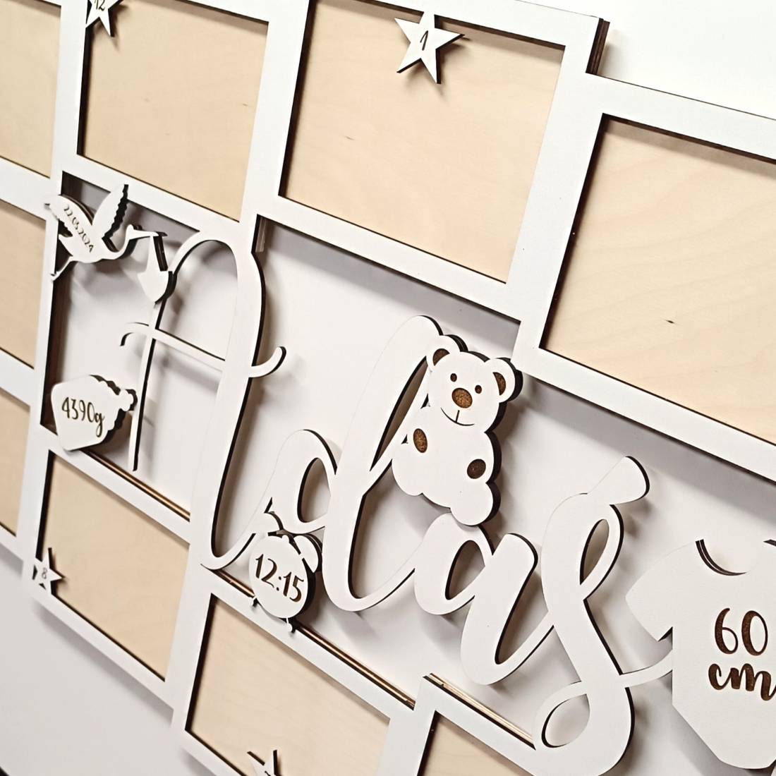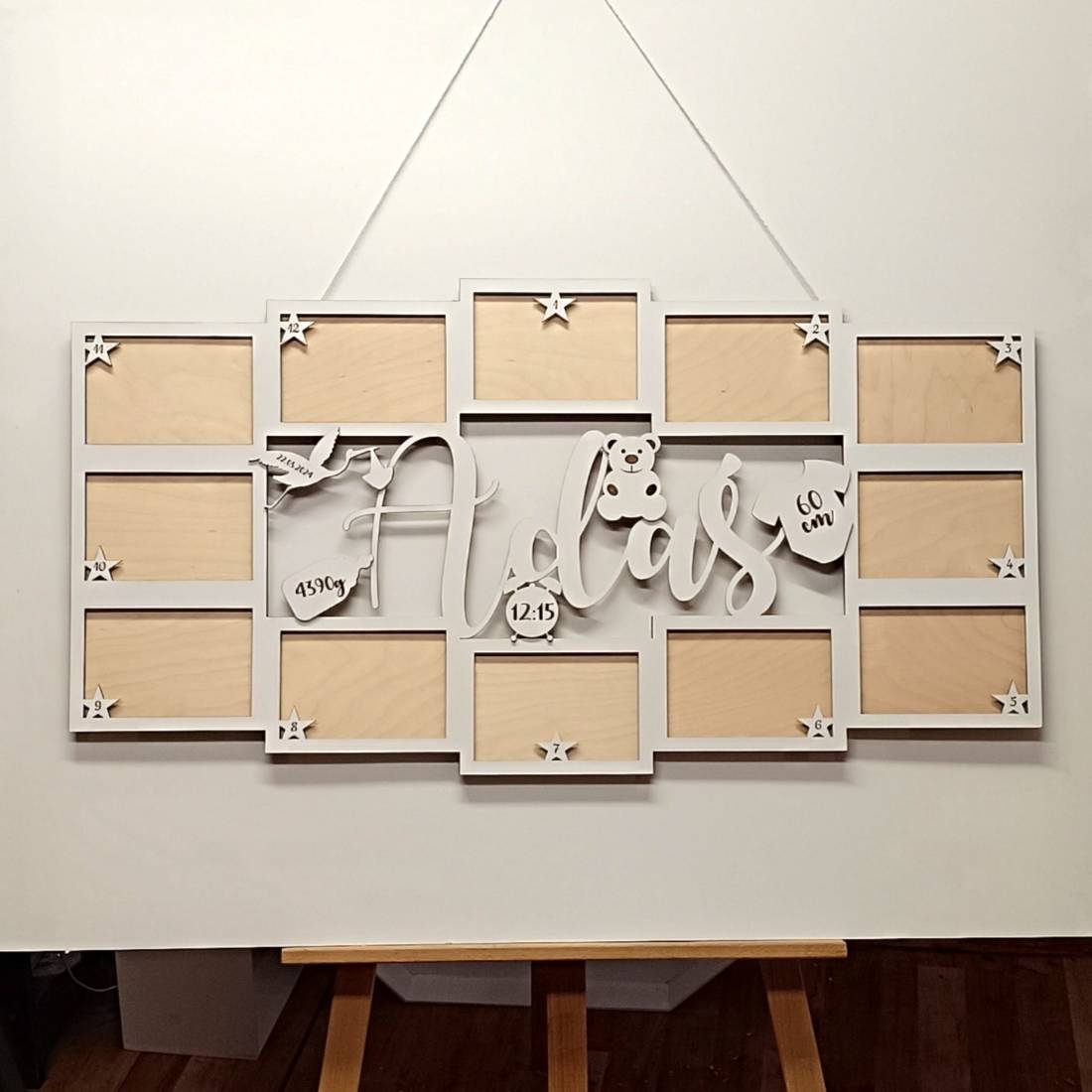 Ta elegancka dekoracja w wersji poziomej zawiera 12 ramek, zaprojektowanych specjalnie na zdjęcia z każdego z pierwszych 12 miesięcy życia dziecka.