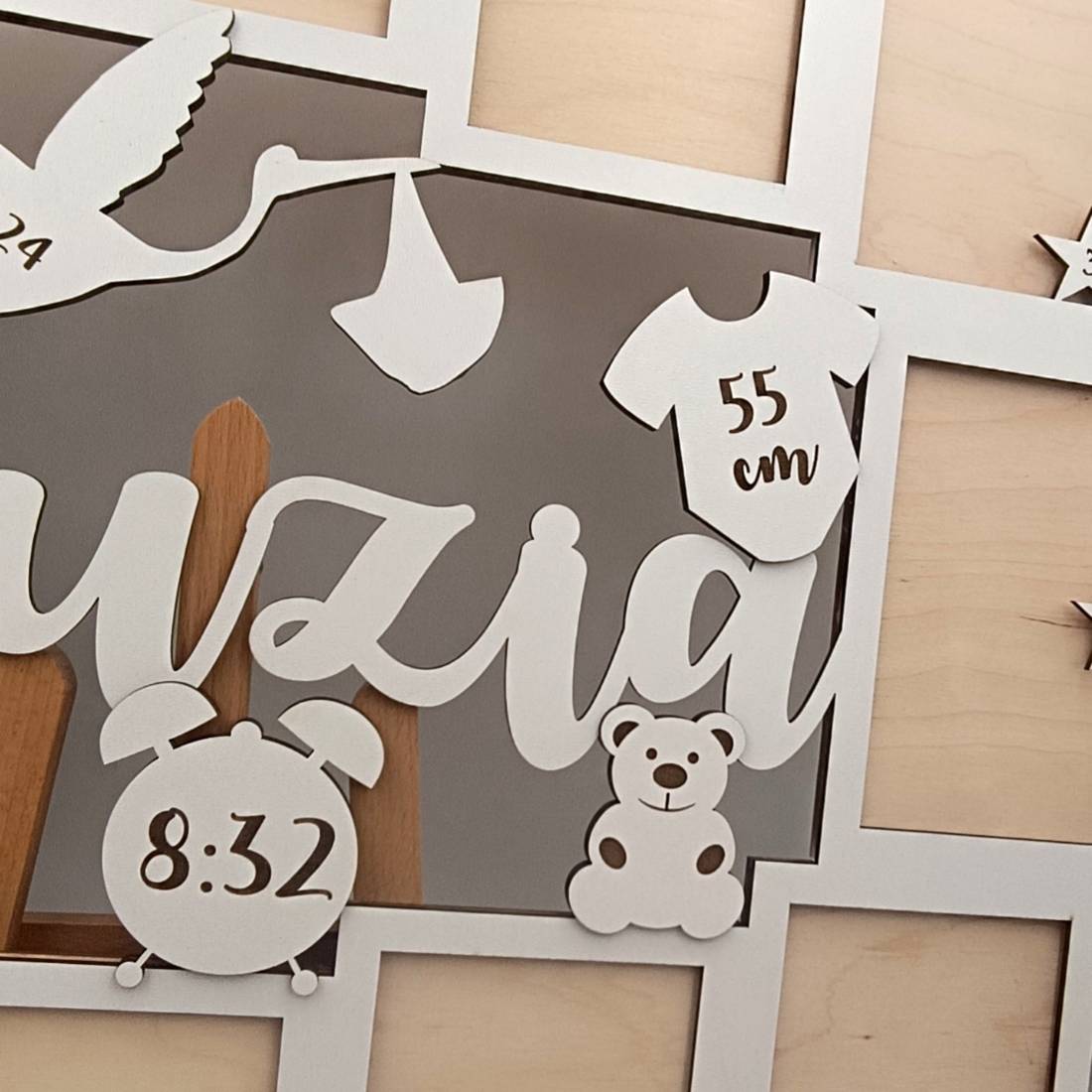 - Materiał: biały hdf oraz naturalna brzozowa sklejka o grubości 3 mm