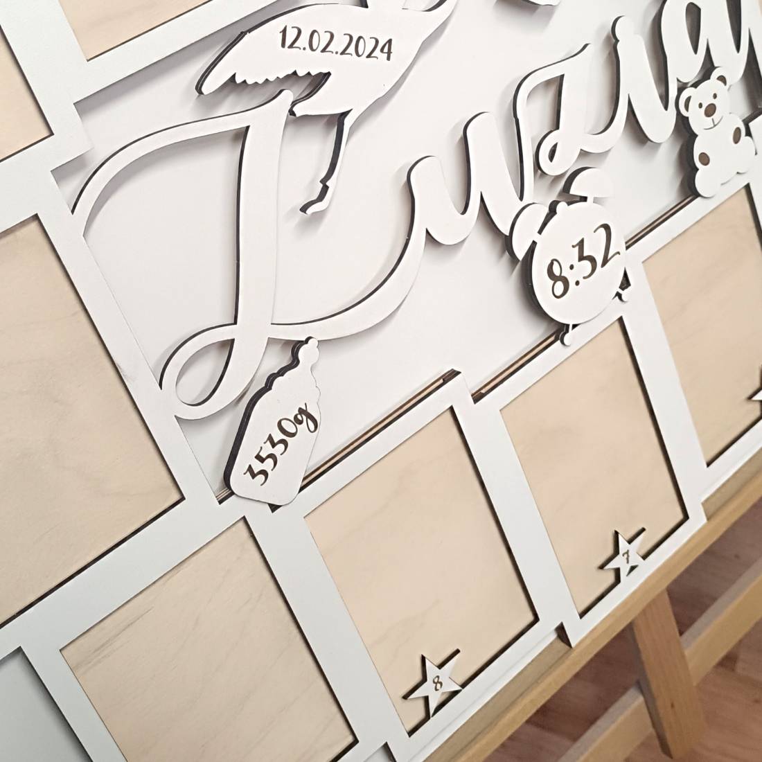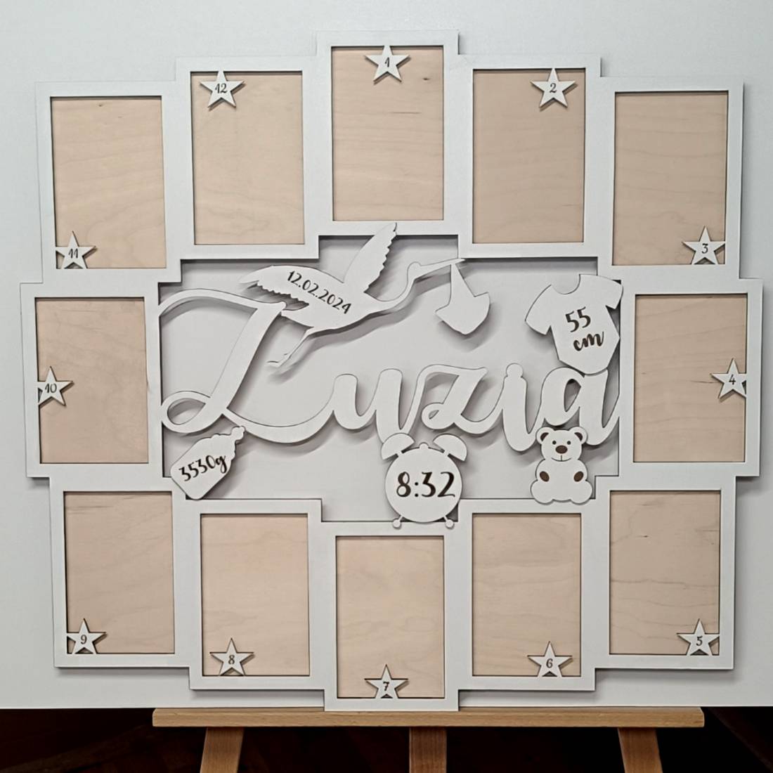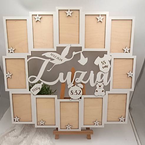 Ta piękna dekoracja zawiera 12 ramek, idealnie zaprojektowanych na zdjęcia z każdego z pierwszych 12 miesięcy życia dziecka, dzięki czemu możesz zachować i cieszyć się wspomnieniami najważniejszych chwil z dzieciństwa swojego maluszka.